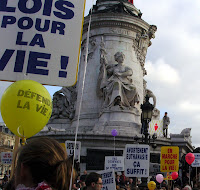 "Sunday's march was preceded on Saturday evening with a prayer vigil (right) for Catholics at L'Église St Francois-Xavier, a particularly beautiful church. Between seven and eight hundred people, mostly in their twenties, attended. We were impressed by the sermon given by Monsigneur Chauvet, the parish priest. He explained very clearly the Catholic Church's teaching on the dignity of the human person, the important place of conscience and the respect due to the human body. The young people were therefore well-versed in the reasons for participating in the next day's march.