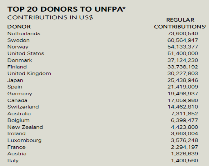 The brutal Chinese one-child policy receives support and funding from the United National Population Fund (UNFPA). Extensive details of this support are listed below. In 2010 the UK was listed as the seventh highest regular donor to the UNFPA and gave the highest amount of what the UNFPA categorise as 'Other contributions'. The UK gave a grand total of US$97,840,118 (£60,573,145.13) to UNFPA in 2010 alone.